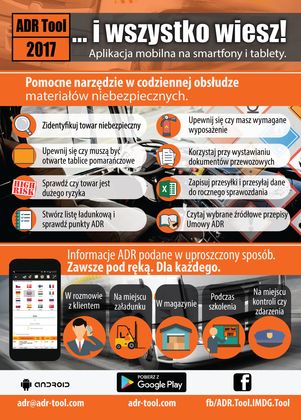 ADR Tool 2017 to już druga edycja cenionej na świecie aplikacji mobilnej o towarach niebezpiecznych ADR, dostępnej w Google Play (platforma Android).
