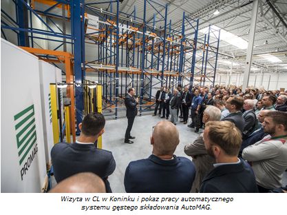 II Forum Logistyczne MAGAZYN PRZYSZŁOŚCI miało przede wszystkim wymiar praktyczny, dlatego wszyscy jego uczestnicy udali się również do Centrum Logistycznego PROMAG S.A. w Koninku, gdzie obejrzeli z bliska pracę w pełni zautomatyzowanego systemu gęstego składowania i transportu AutoMAG. W trakcie tego pokazu PROMAG po raz pierwszy zaprezentował nowy, w pełni autorski produkt, jakim jest wózek transferowy o nazwie AutoMAG Mover. Urządzenie to w połączeniu wózkiem wahadłowym AutoMAG Shuttle oraz przenośnikiem pionowym  AutoMAG Lift pozwala całkowicie wyeliminować wózki widłowe z obszaru składowania towarów i daje możliwość stworzenia w pełni autonomicznego systemu składowania. Dzięki temu rozwiązaniu PROMAG S.A. wprowadził na rynek bardzo efektywny automatyczny system składowania.