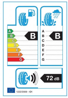 •  Efektywność paliwowa (ikona z dystrybutorem) – określana przez współczynnik oporów toczenia opony. Jest wyrażona za pomocą klas od A do G, gdzie A oznacza najbardziej oszczędną oponę – opony najwyższej klasy A pozwolą zaoszczędzić do 7,5% paliwa w porównaniu do opon najniższej klasy G.