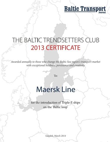 Maersk Line, podczas odbywającej się w Gdańsku w dniach 4-6 marca konferencji Transport Week, po raz trzeci otrzymał wyróżnienie The Baltic Trendsetters Club Certificate. Tym razem zostało ono przyznane armatorowi za wprowadzenie na Bałtyk największych kontenerowców świata klasy Triple-E.