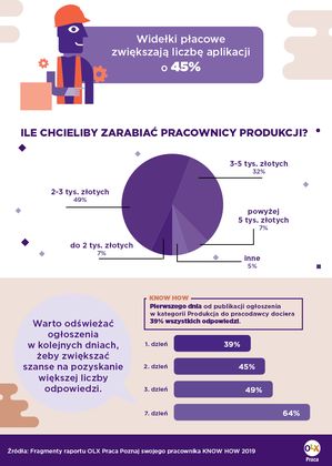 W 2018 roku najwięcej ogłoszeń w branży produkcyjnej opublikowano na portalu OLX Praca – aż 10 tys. (dla porównania ofert na stanowisko kasjer/ekspedient opublikowano 9,8 tys., a kierowca – 9,7 tys.). Konkurencja jest duża, dlatego warto podejść do tematu ogłoszenia bardzo skrupulatnie. Dla większości kandydatów jest to jedyny moment, gdy mają styczność z marką, niezbędna jest więc odpowiednia zachęta do podjęcia współpracy. Uwzględnienie powyższych wskazówek spowoduje, że oferta zamieszczona na portalu będzie atrakcyjniejsza, a liczba napływających CV bardziej satysfakcjonująca.