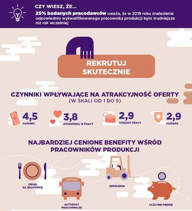 Jak wynika z opinii pracowników produkcyjnych, zebranych w ramach badania OLX, umiejętnie dobrany pakiet udogodnień świadczy o tym, w jaki sposób firma ich traktuje. Najbardziej cenione benefity to: obiad za „złotówkę”, autobus pracowniczy czy możliwość szkolenia się np. z obsługi wózków widłowych. Ważniejsze od benefitów są jednak relacje z szefem.