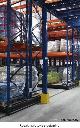 Magazyn wyrobów gotowych w OSM Kalisz został wyposażony przez PROMAG S.A. w dwa systemy regałowe. Pierwszy tworzą regały paletowe przejezdne. Stanowią one doskonałe rozwiązanie dla tych firm, które chcą maksymalnie wykorzystać powierzchnię składowania (np. kiedy jest ona stosunkowo nieduża), a jednocześnie zależy im na tym by mieć dostęp do każdej jednostki ładunkowej. Wszystkie regały zostały zamocowane na specjalnych wózkach poruszających się po szynach, co pozwala udostępniać dowolny korytarz międzyregałowy i umożliwia pobranie wymaganej palety. W przypadku KSGMP takie rozwiązanie pozwoliło uzyskać aż o 100% więcej miejsc paletowych, w porównaniu do możliwości jakie daje system tradycyjnych regałów rzędowych.