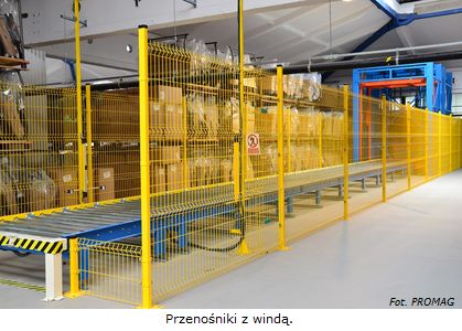 Transport towarów z produkcji realizowany jest za pomocą przenośników a następnie na antresolę za pomocą dwóch wind również dostarczonych przez PROMAG S.A. Umożliwiają one pracę rewersyjną w zależności od aktualnych potrzeb – przy nasileniu produkcji obie windy realizują załadunek na pomost, przy nasileniu wysyłek towarów obie realizują rozładunek towaru z pomostu, natomiast przy normalnym trybie pracy, jedna zajmuje się załadunkiem a druga rozładunkiem. Windy wyposażone zostały w miejsca buforowe na dole pod antresolą i na antresoli. Każde z nich może pomieścić 10 palet.