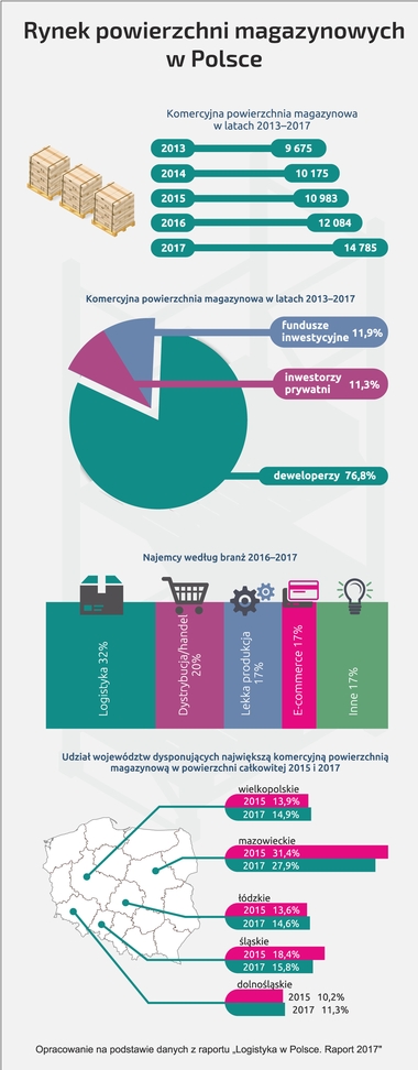 Według badań Instytutu Logistyki i Magazynowania komercyjna powierzchnia magazynowa w Polsce na koniec 2017 r. wynosiła prawie 15 mln m kw., na co złożyły się nie tylko nowe wielkopowierzchniowe magazyny będące obiektem zainteresowania firm analizujących transakcje na rynku nieruchomości magazynowych i pośredniczących w ich wynajmie, ale również mniejsze obiekty magazynowe nie będące w polu ich zainteresowania. W 2016 r. wielkość nowej powierzchni oddanej do użytku wyniosła ponad 1,1 mln m kw., podczas gdy rok wcześniej było to ok. 0,8 mln m kw. W 2017 r. wzrost był jeszcze wyższy i wyniósł prawie 2,8 mln m kw.