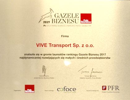 28 lutego br., podczas uroczystej gali w Starej Zajezdni w Krakowie, ogłoszone zostały wyniki Gazel Biznesu 2017 – rankingu najdynamiczniej rozwijających się małych i średnich firm. W gronie laureatów tegorocznej edycji rankingu znalazła się spółka VIVE Transport. Spółkę reprezentowali: prezes Grzegorz S. Woelke oraz rzecznik prasowy Grupy VIVE Ewelina Rozpara.